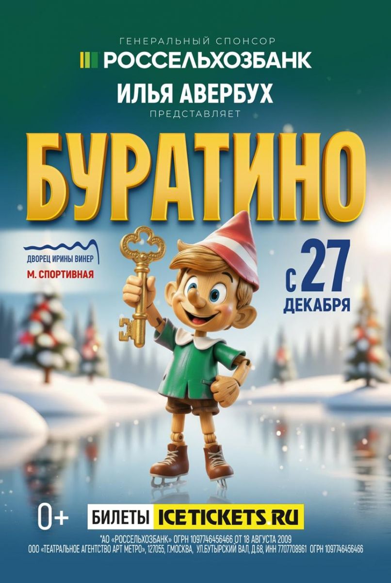 Премьера новогоднего ледового спектакля Ильи Авербуха «Буратино» впервые в этом году пройдет на новой площадке во Дворце гимнастики Ирины Винер с 27 декабря по 07 января. В спектакле участвуют звезды российского фигурного катания Алексей Ягудин, Татьяна Тотьмянина, Максим Маринин, Максим Шабалин, Матвей Ветлугин, Андрей Ежлов, Софья Шевченко и другие. Главную роль Буратино исполнит победительница и призер этапов юношеских гран-при, буквально несколько дней назад выигравшая взрослый Гран-при России Алиса Двоеглазова.