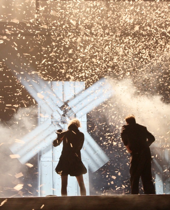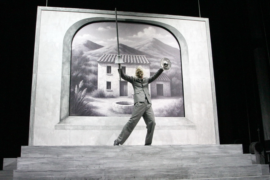 «Главная проблема в спектакле не  проблема Дон Кихота, а проблема вообще природы театра» - видимо, ключевое, о чём хотел «поговорить» с публикой режиссёр Николай Рощин в своей постановке. Он же  - сценограф и инсценировщик спектакля «Дон Кихот». Главная, на мой скромный вкус, заслуга Рощина, что в работе с артистами он использовал музыкальные термины – «настраивал звучание инструментальных и вокальных фрагментов». Зритель наблюдает за репетицией — довольно трагикомичным процессом, в котором есть и кино - роуд-муви про сегодняшних Санчо и Дон Кихота. А в конце «все рушится, летит, взрывается и падает». Это я про те самые огромные конструкции с подъемно-опускными механизмами, которые крутят сами актёры, уникальные и масштабные декорации, к которым, в финале присоединяются мельницы, без которых «Дон Кихот» невозможен.