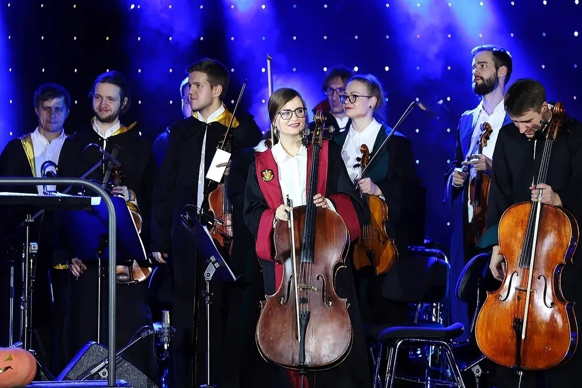 На сцену выйдет не просто оркестр - это коллектив юных магов-учеников школы Хогвартс. Со всех четырёх факультетов были собраны самые талантливые студенты: скрипки из Гриффиндора, альты и виолончели из Слизерина, деревянные духовые из Пуффендуя, а медные духовые и ударные - из Когтеврана.