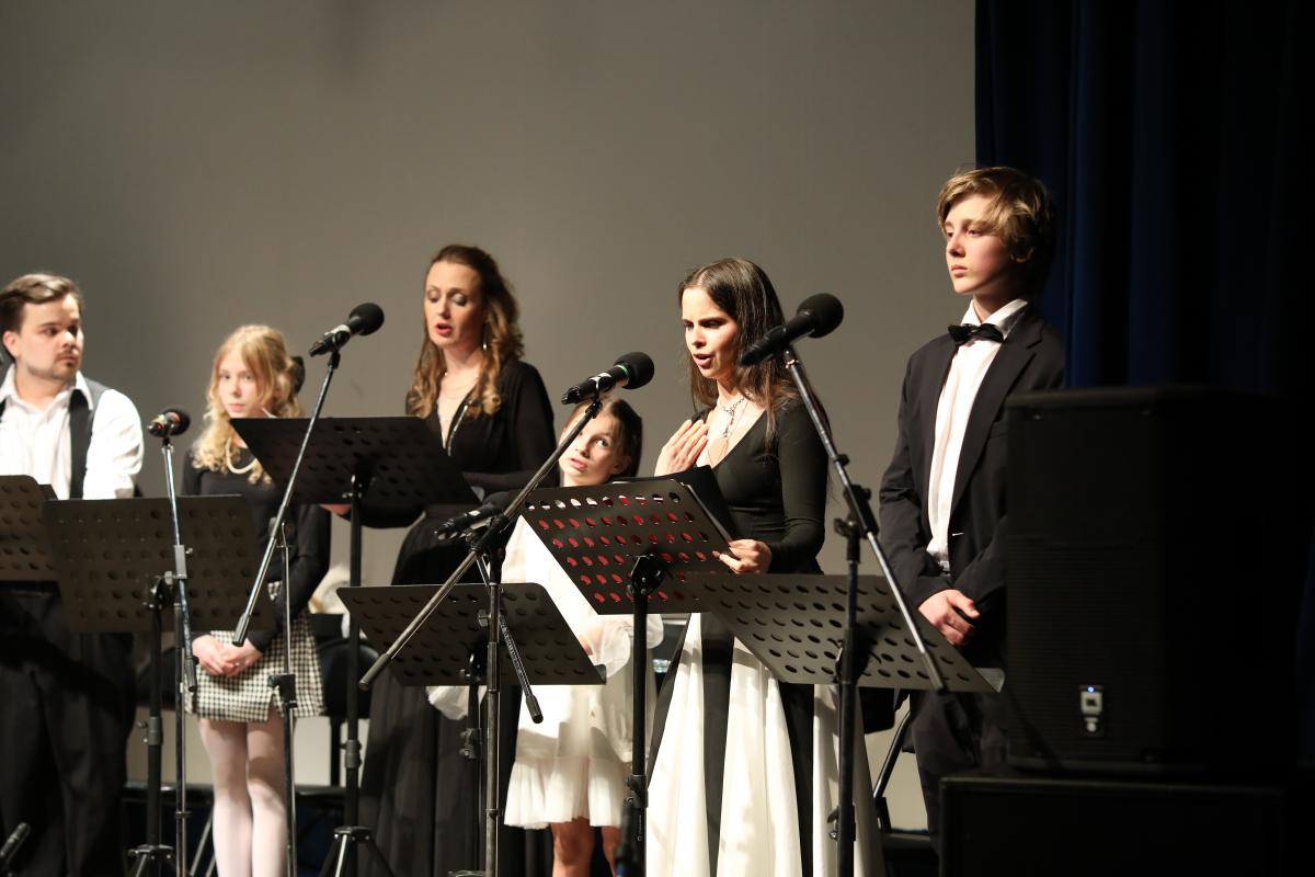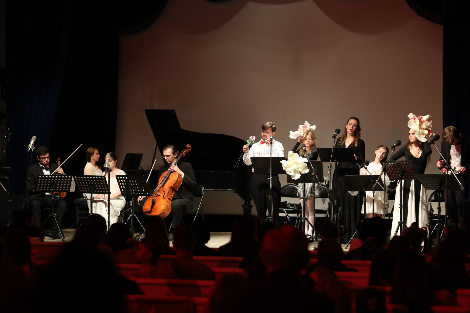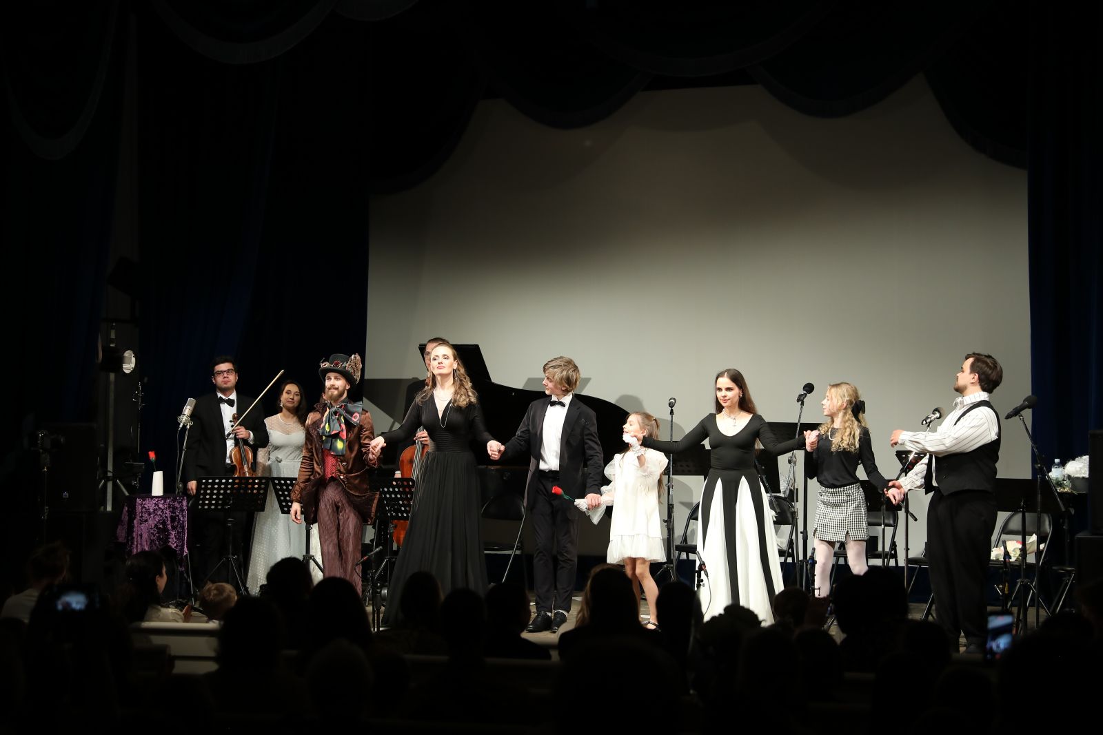 А на сцене было многолюдно. Слева расположился камерный квартет: фортепиано – Анастасия-Кристина Кульбацкая, скрипка – Алексей Филиппов, флейта – Екатерина Стукалина, виолончель – Ростислав Чучалин. На правой стороне находились чтецы и вокалисты: трое взрослых – Михаил Мышлянов (бас-баритон), Екатерина Берез (сопрано), Алена Романова (сопрано), трое юных – Николай Панков, Василиса Стенечева, Агния Лещенко. Кстати, последней, самой молодой участнице проекта, была доверена роль Алисы. Агния не только озвучивала своего персонажа, но и танцевала, и ассистировала иллюзионисту. Дети-актеры ничуть не уступали в профессионализме и артистизме взрослым, ведь за их плечами уже многолетний театральный опыт работы в московских театрах.