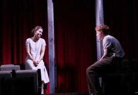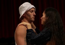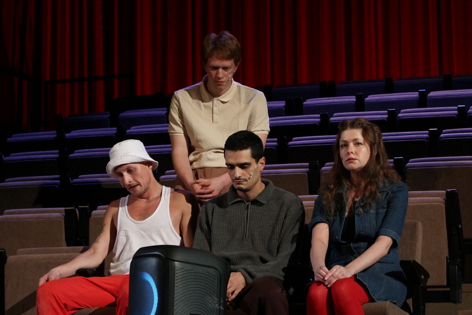 Сама премьерная постановка (журналистам на пресс-показе представили весь спектакль – 2часа 40 мин. с двумя антрактами) начинается с провокации: объявляется со сцены о скоропостижной смерти режиссёра – вот такой «чёрный юмор». Для особо «нервных»: первый акт длится всего 15 минут, а далее – «Общага – это модель мира». В оформлении сцены создатели спектакля использовали образ зеркала: в первом акте зеркальный занавес, во втором всё сценическое пространство становится зеркалом. А заканчивается всё и вовсе КАБАРЕ…