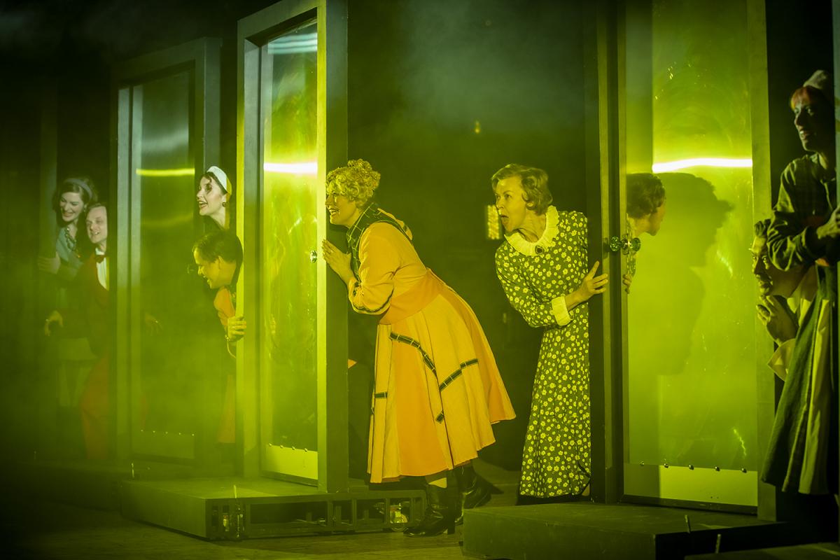 В основе сценографии спектакля – декорации дверей, создавшие на сцене ощущение многолюдного коридора коммунальной квартиры. Яркие костюмы Ольги Ивановой замечательно дополнили общее настроение «Покровских ворот» – мечтательное, энергичное и духоподъемное.