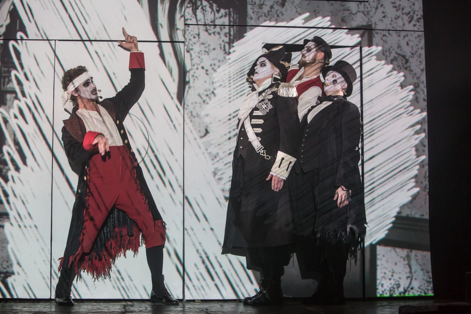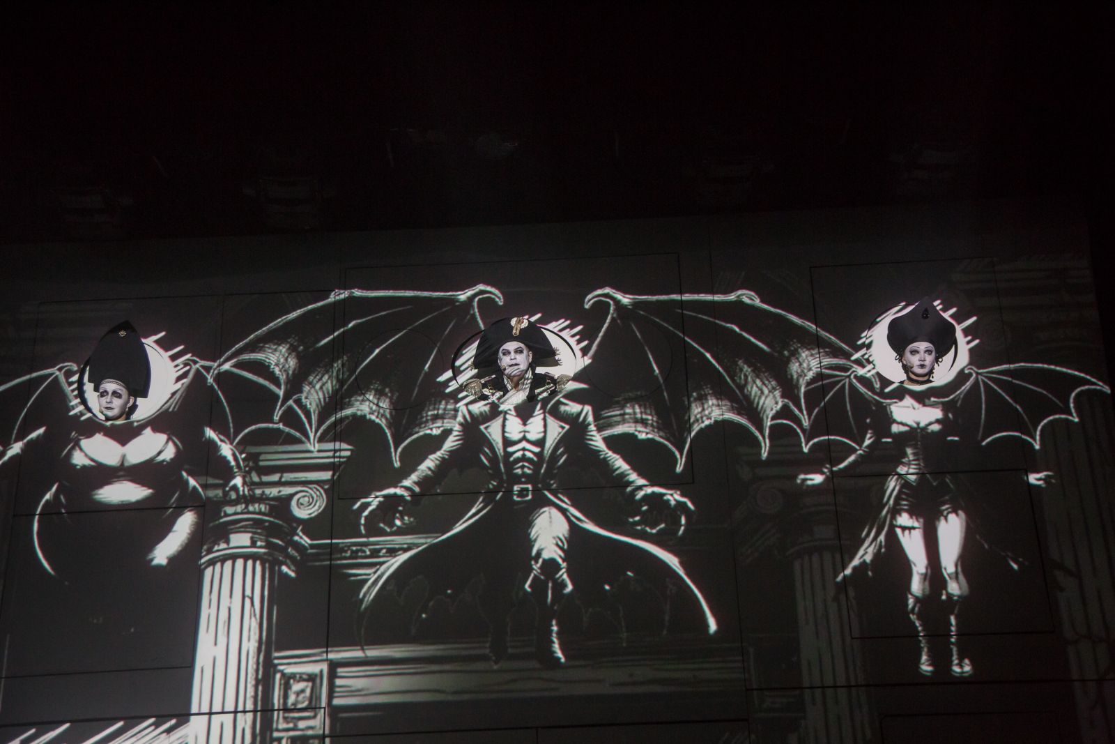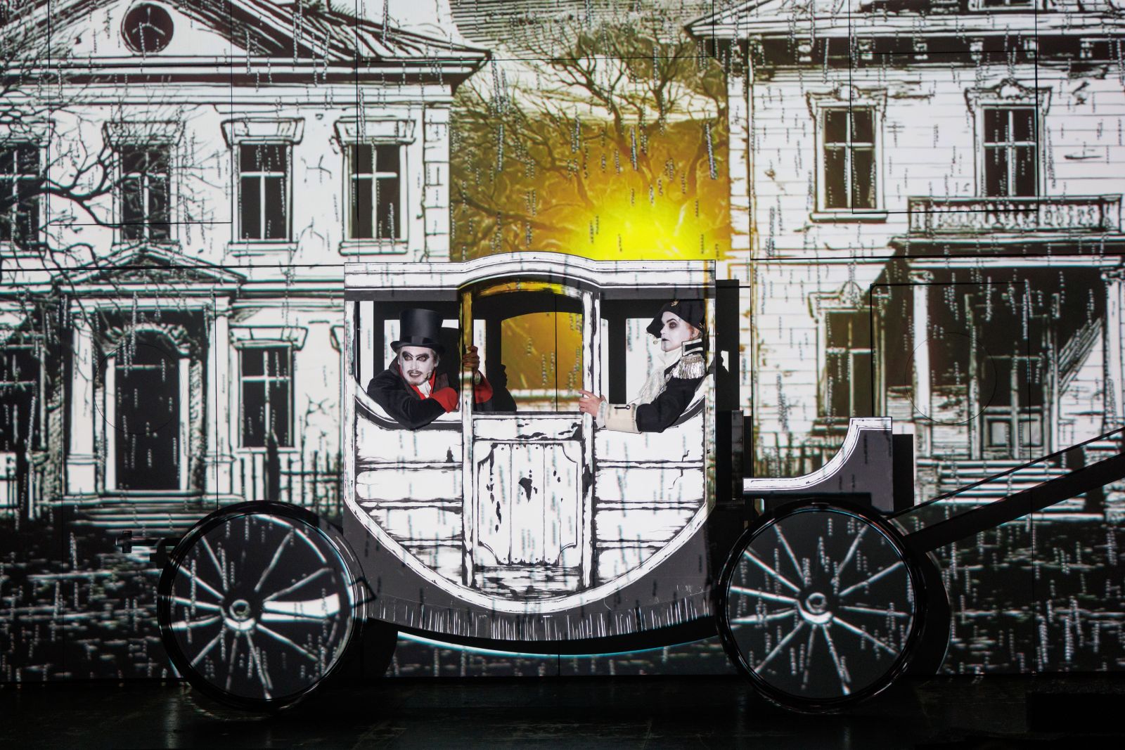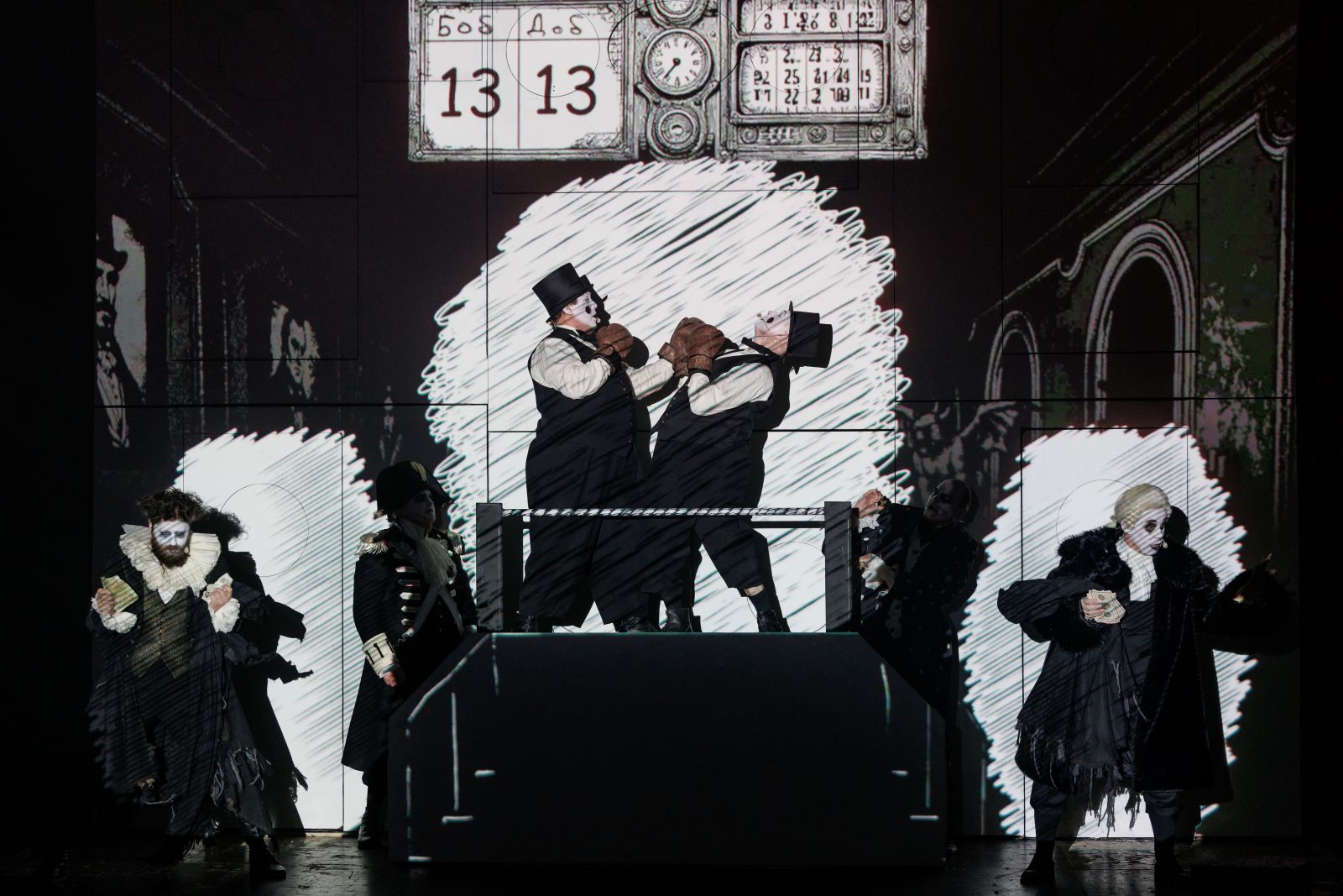 Композитор Сергей Азеев облек повествование в современные ритмы, а художник Антон Левдиков и видеохудожник Александр Плахин создали на сцене реальность в стиле неонуара и готического комикса, где действие разворачивается не в пространстве, а на плоскости, в черно-белом мире, населенном карикатурными персонажами.