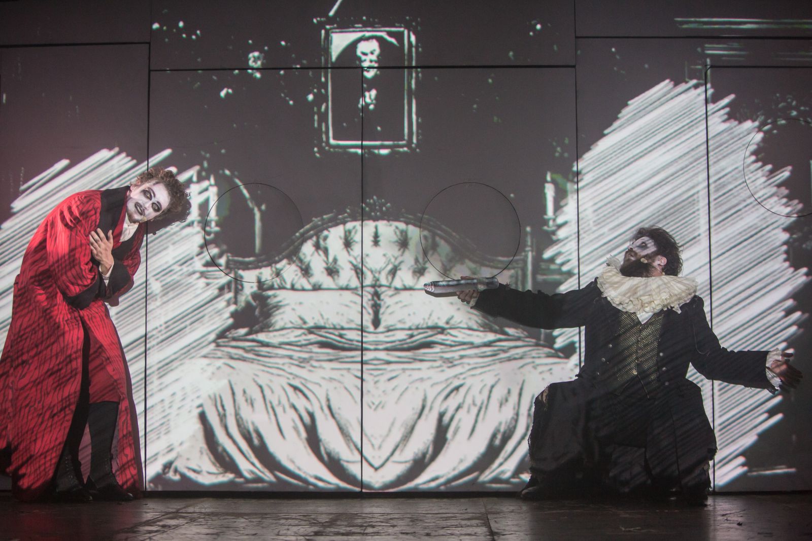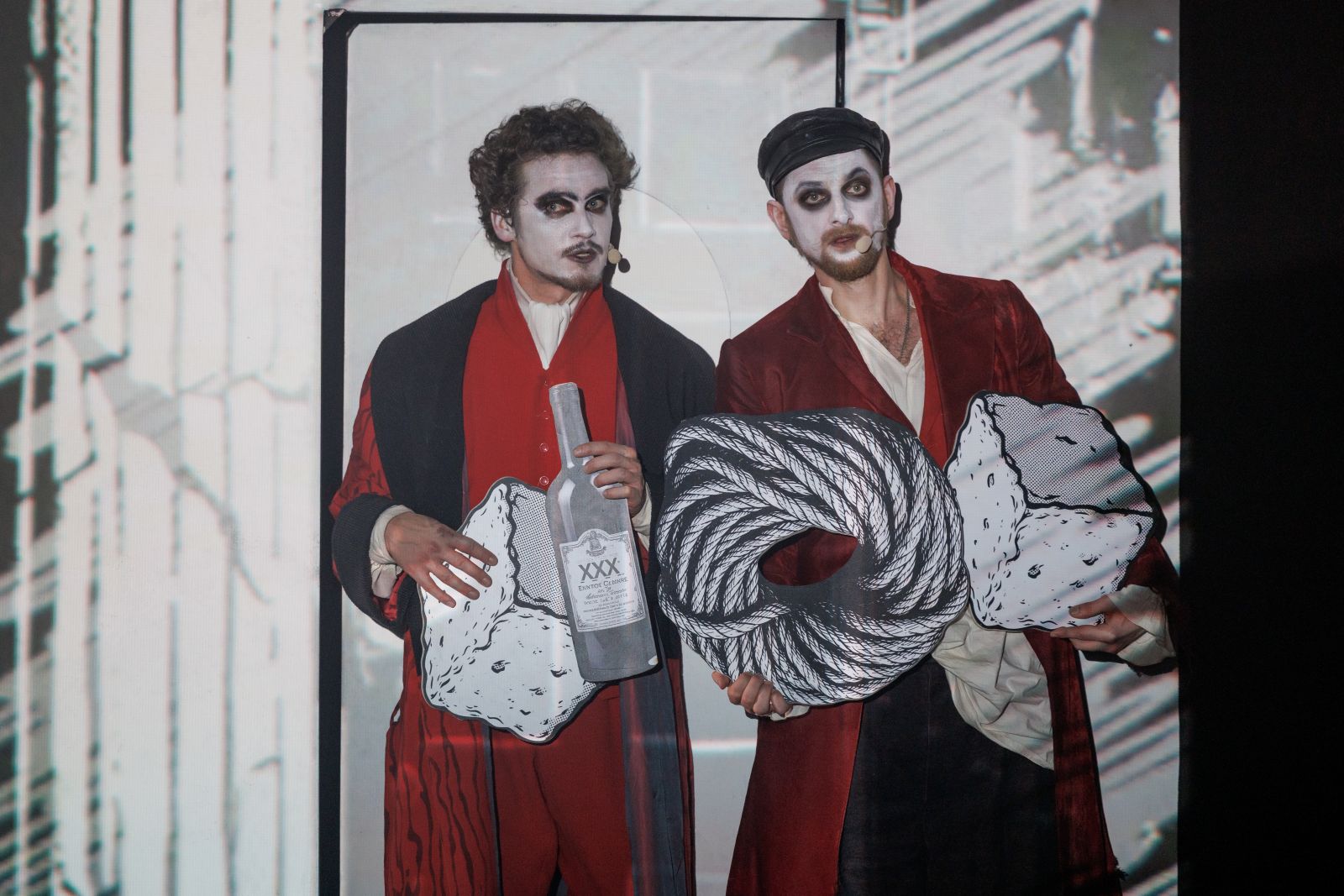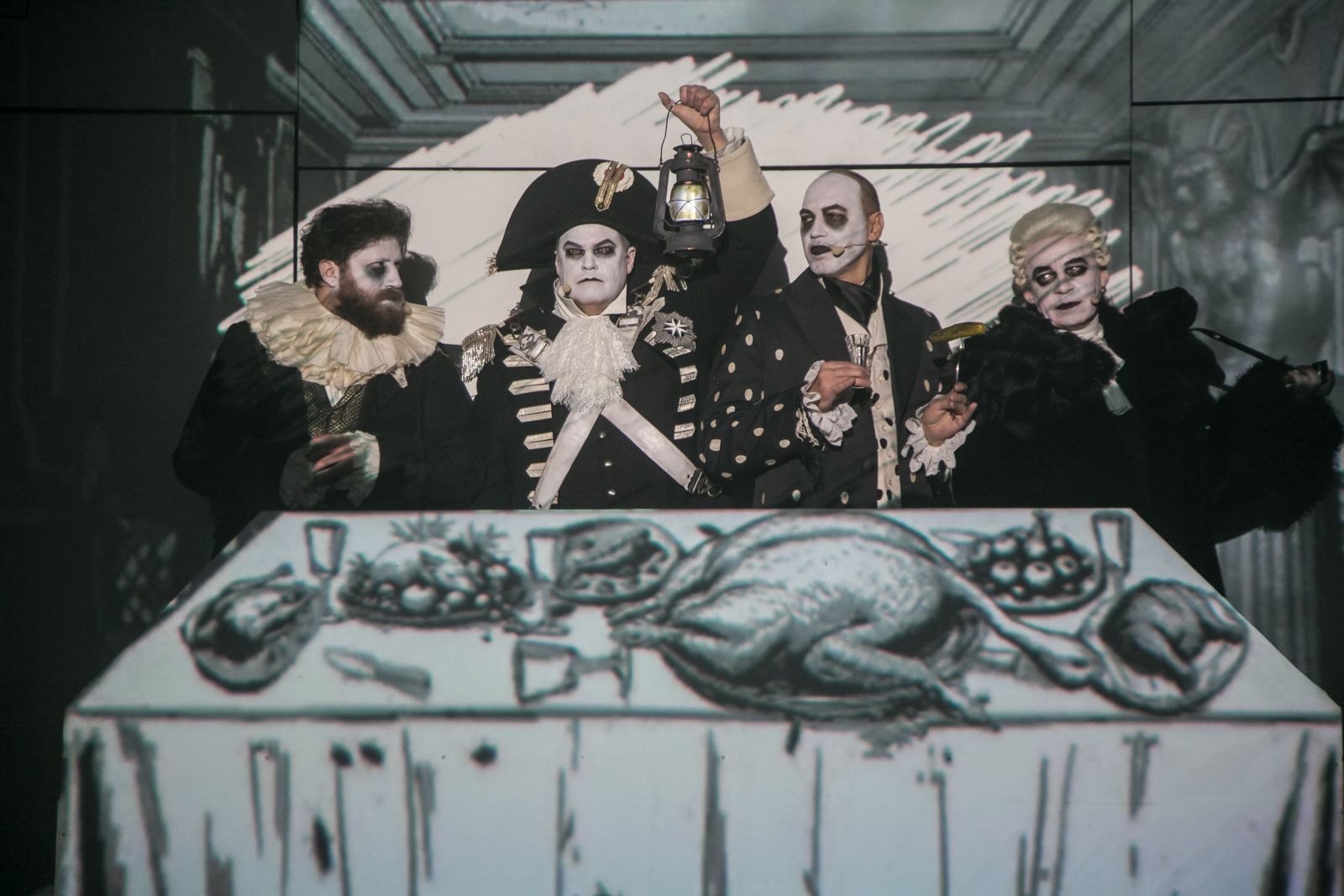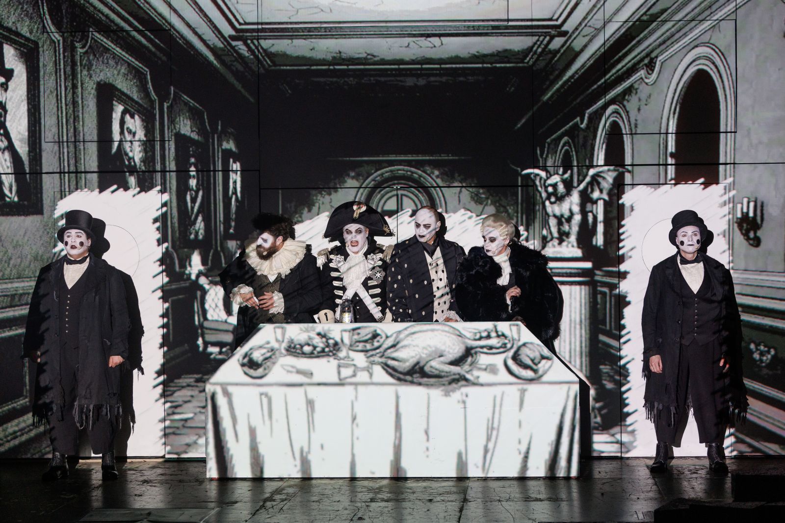 Композитор Сергей Азеев облек повествование в современные ритмы, а художник Антон Левдиков и видеохудожник Александр Плахин создали на сцене реальность в стиле неонуара и готического комикса, где действие разворачивается не в пространстве, а на плоскости, в черно-белом мире, населенном карикатурными персонажами.