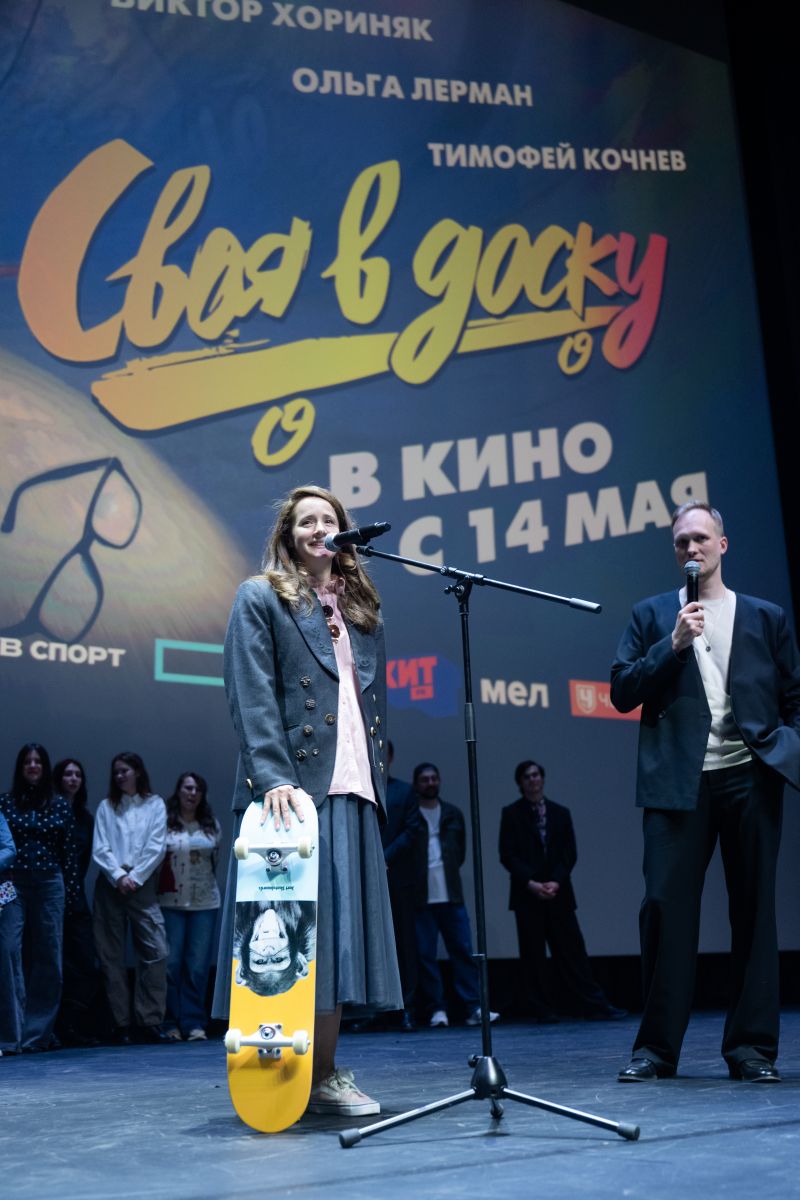 25 апреля в столичном кинотеатре «Синема Парк Мосфильм» прошла светская премьера комедии «Своя в доску» с Ольгой Лерман в главной роли. Героиня Ольги — школьная учительница физики, которая держит под контролем всё и вся, кроме сына-подростка. После заявления о том, что парень решил бросить школу ради экстремального спорта, ей придется самой освоить катание на скейте, чтобы одержать победу в поколенческом споре.