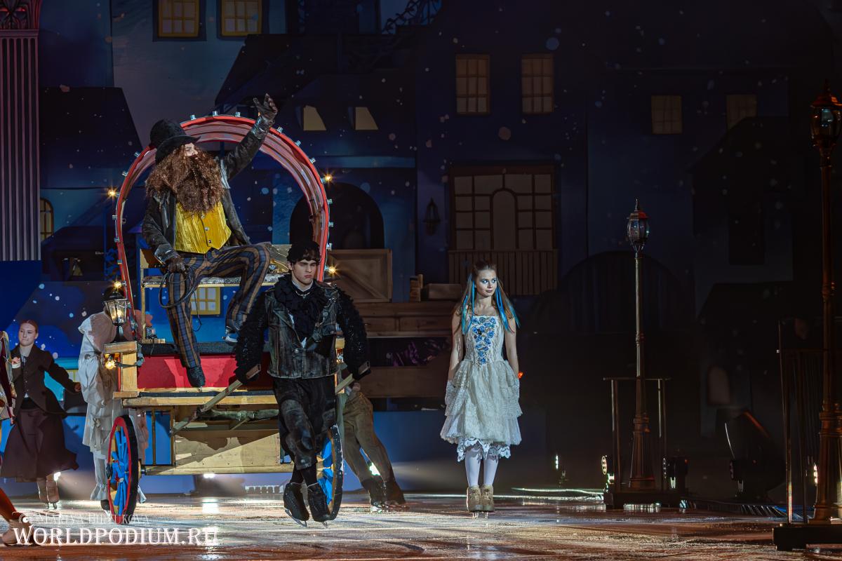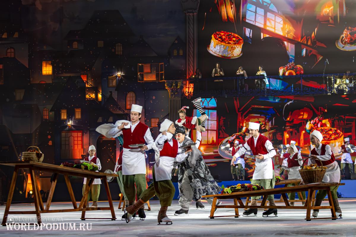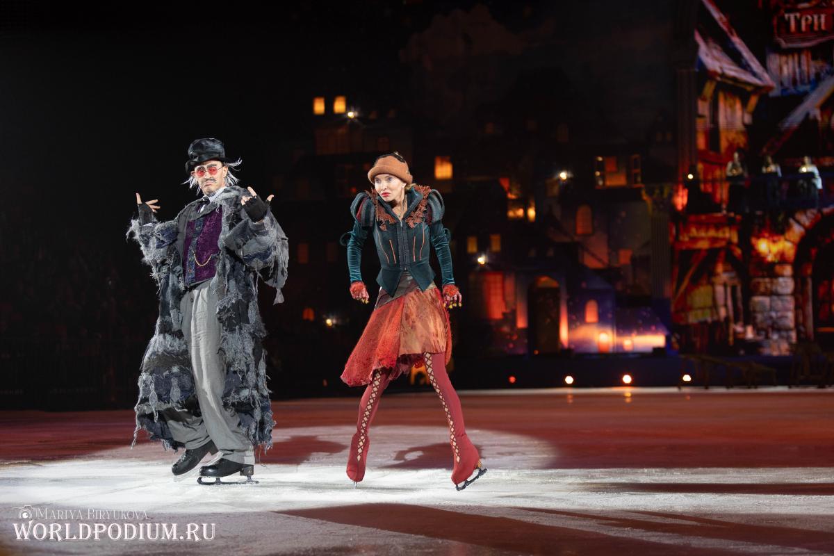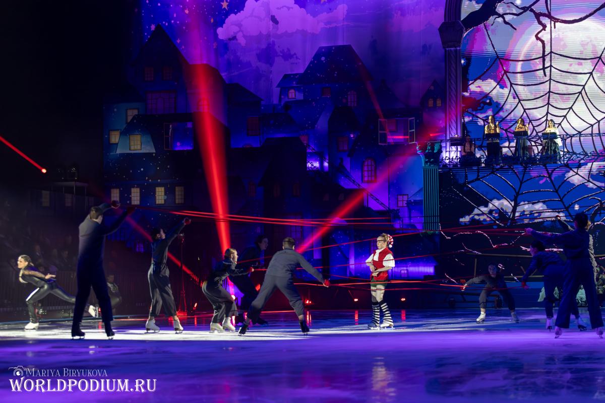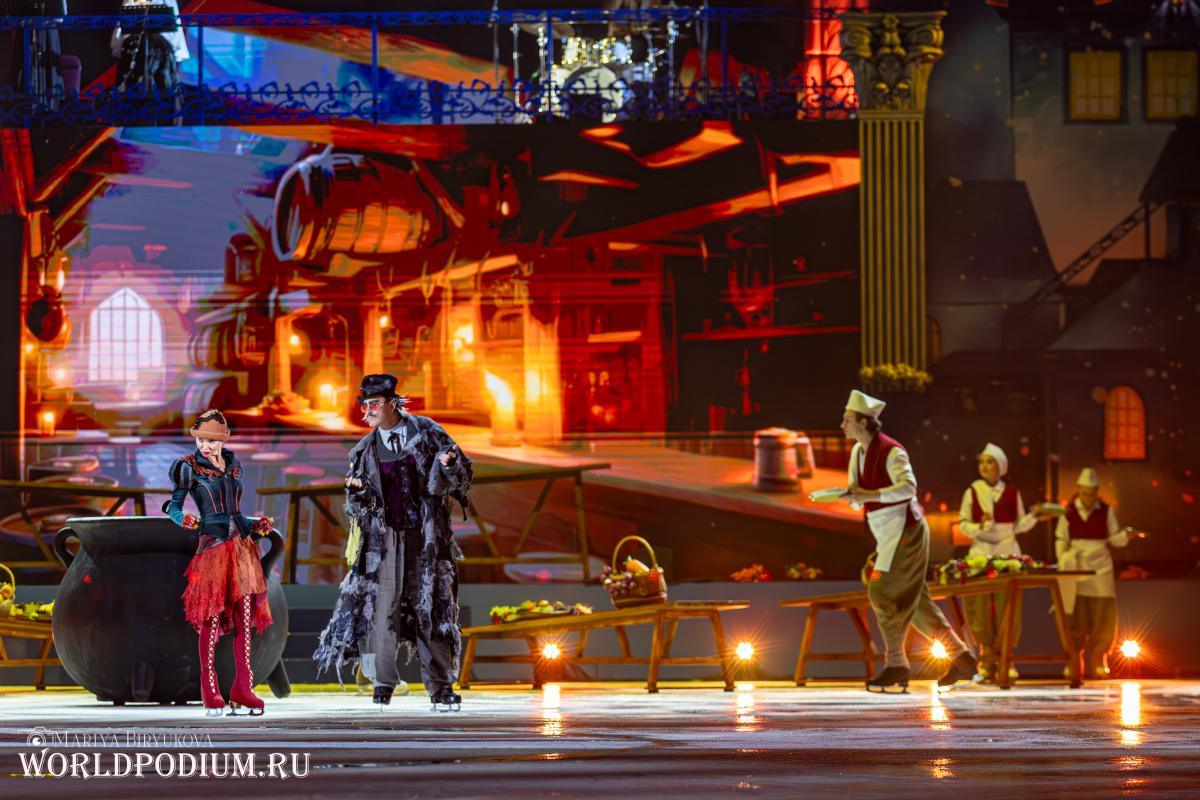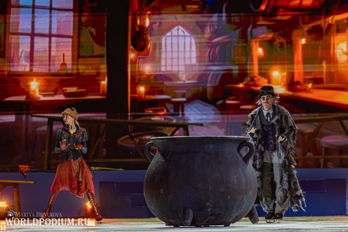 Вокалисты и музыканты возвышаются над сценой, где также, как и на льду, разворачивается увлекательное действие. Массовые сцены на городской площади, в театре, трактире «Три пескаря» и во всех других локациях создаёт виртуозный ледовый балет под руководством Анастасии Игнатьевой, которая предстаёт в образе Паучихи.