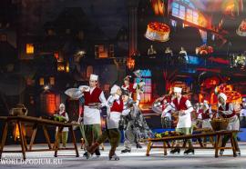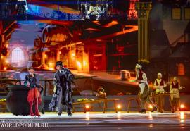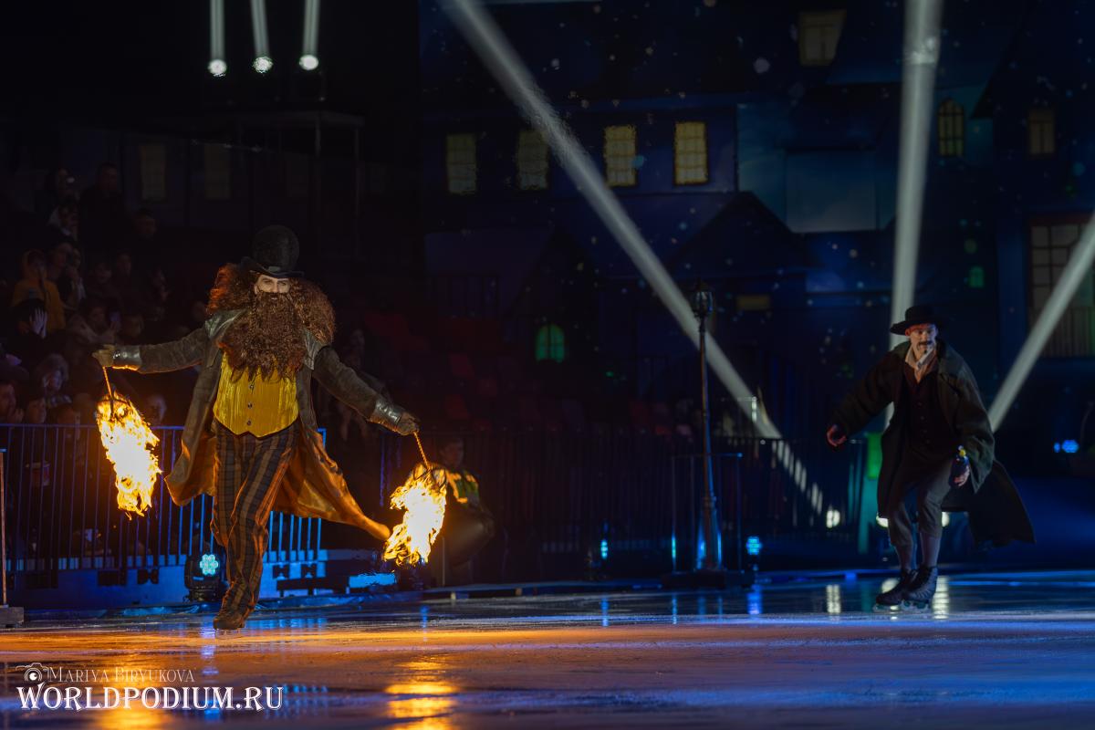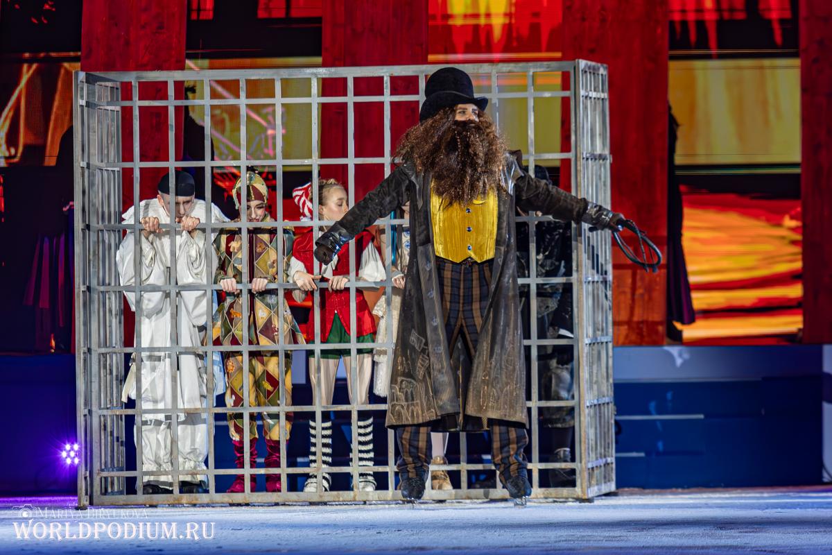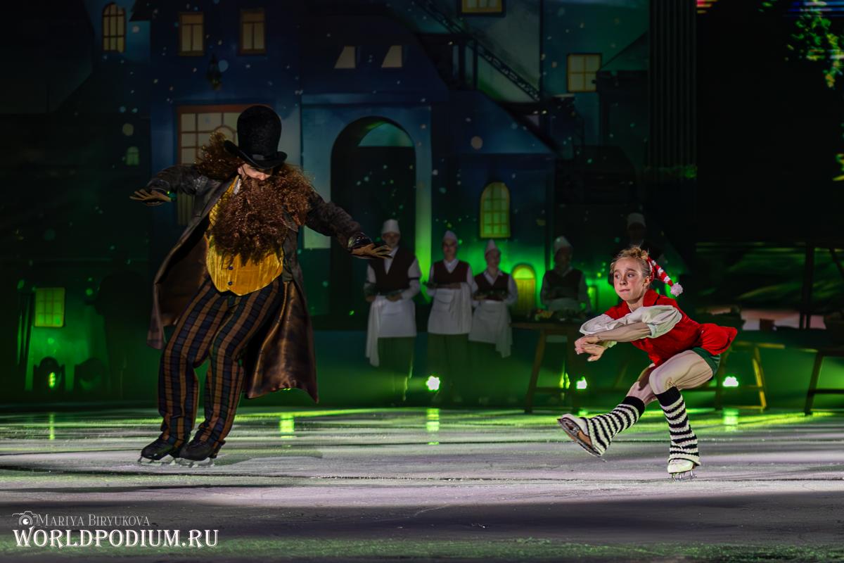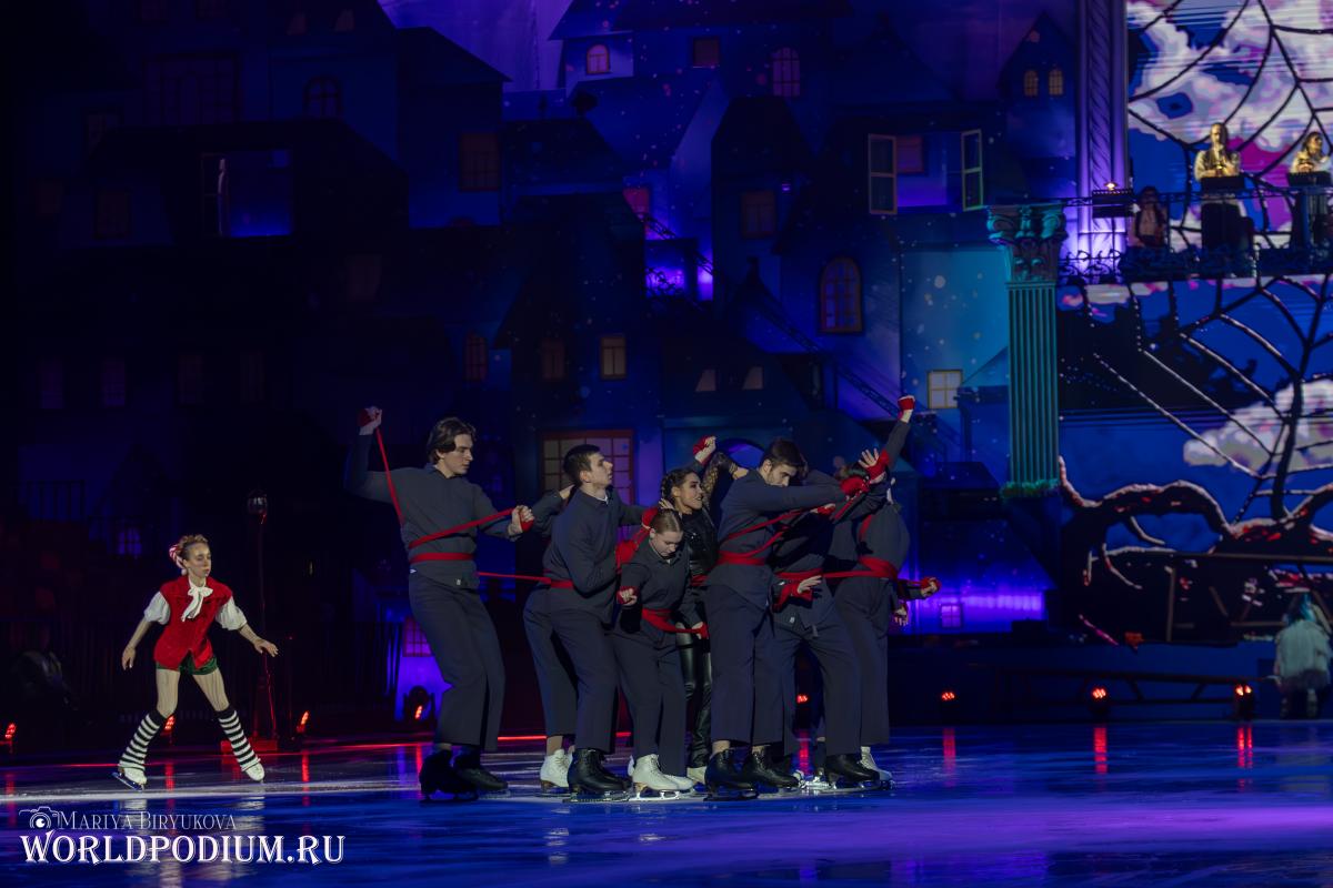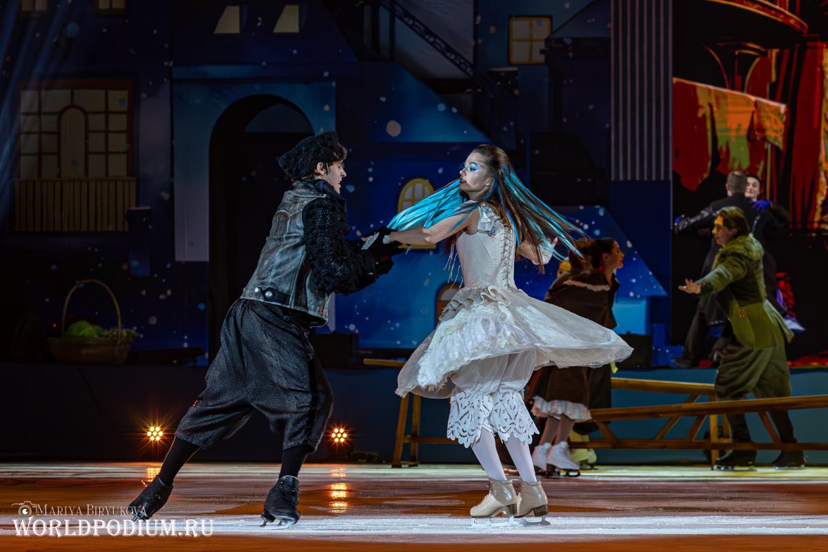 Вокалисты и музыканты возвышаются над сценой, где также, как и на льду, разворачивается увлекательное действие. Массовые сцены на городской площади, в театре, трактире «Три пескаря» и во всех других локациях создаёт виртуозный ледовый балет под руководством Анастасии Игнатьевой, которая предстаёт в образе Паучихи.