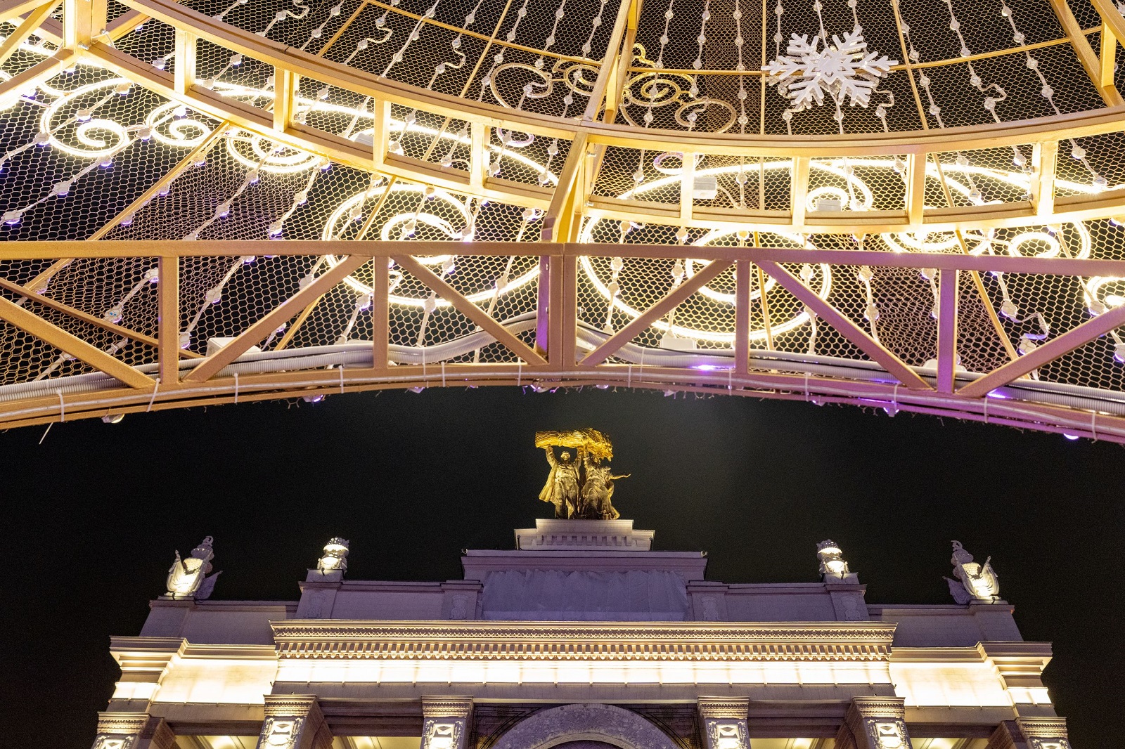 Посетителей перед аркой Главного входа встречает гигантский шар. Поверхность огромной елочной игрушки отделана золотым кружевом и светится яркими огнями. Внутри конструкции есть скамейки, где можно отдохнуть во время прогулки и сделать несколько кадров.