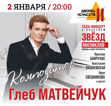 В праздничные новогодние дни в Санкт-Петербурге состоится большой Гала-концерт композитора Глеба Матвейчука, посвящённый его театральному творчеству! Гала концерт композитора Глеба Матвейчука - это масштабный музыкальный проект, объединяющий лучшие произведения из мюзиклов Глеба Матвейчука в единое полотно. Специально созданные аранжировки для симфонического оркестра, современная видеографика и хореография превращают концерт в философское путешествие по семи мирам — от первозданных стихий до сложных лабиринтов человеческого сознания.