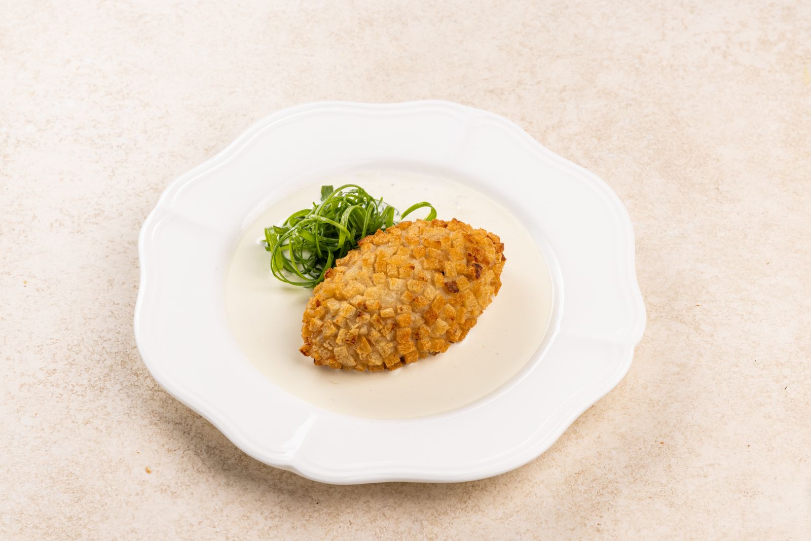 От восточных мотивов - к русской классике: котлета пожарская в хрустящей панировке снаружи и с нежным куриным мясом внутри, дополняется соусом Блю Чиз (750 р.).
