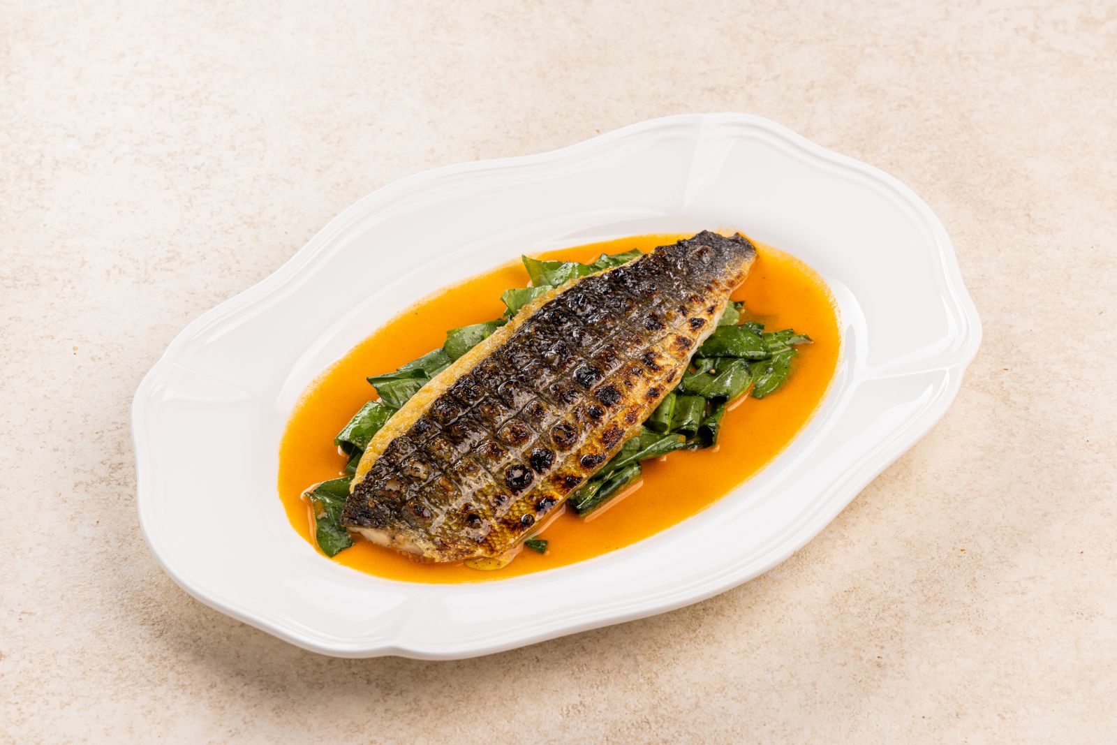 Мурманский лосось готовят в соусе Ромеско на основе печёного перца (1300 р.). Морской окунь получает хрустящую корочку и подаётся с имбирным соусом Вонтон (1250 р.). Сибас томится в пикантном соусе на кокосовом молоке в стиле том ям (1360 р.). Шампур из креветок, кальмаров и мидий обжаривают на углях с беби картофелем и томатами черри (500 р.).