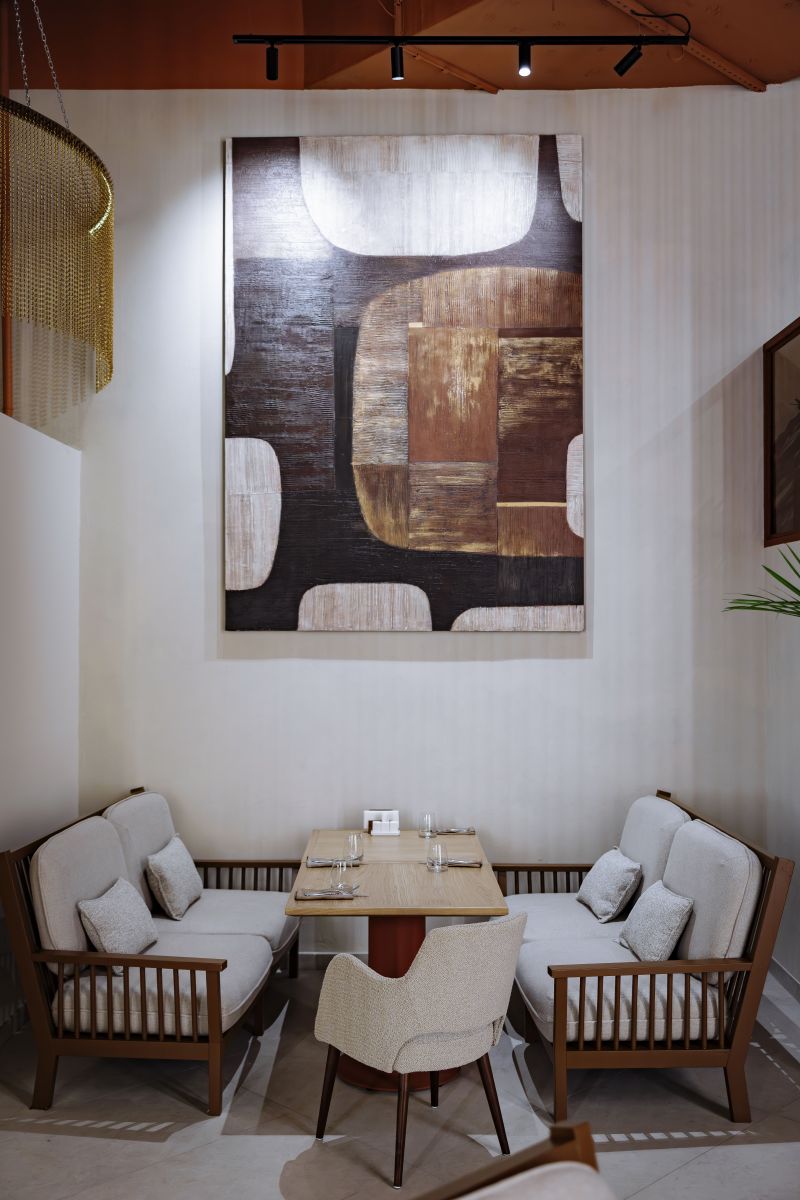 Просторный зал Osh встречает гостей высокими потолками в тёплых медно-терракотовых тонах и золотистыми люстрами с каскадной бахромой. На стенах - скульптурный рельеф, стилизованный под горный массив, выполненный из природных материалов. Мягкие кресла и широкие диваны дополняют пространство. Песочная палитра и дерево - цвета пустыни и старинных городов Востока. Оттенки задают спокойный ритм, характерный для ресторанов Ближнего Востока, где еда - повод для долгого разговора и тёплой встречи.
