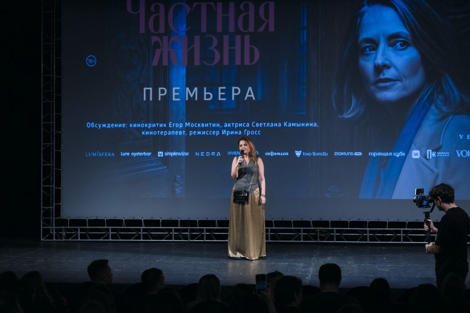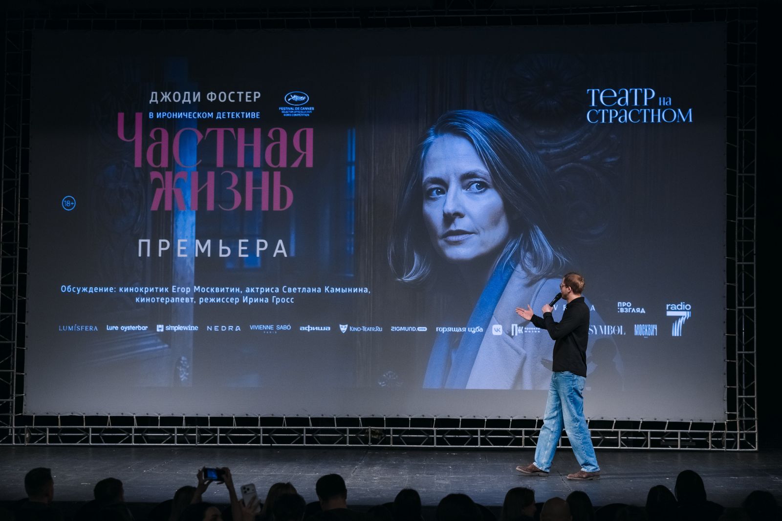 2 марта в Театре на Страстном состоялась светская премьера элегантного детектива с ироничным юмором и безупречным стилем «Частная жизнь» с двукратной обладательницей премии «Оскар» Джоди Фостер в главной роли. В российский прокат фильм выйдет 19 марта 2026 года силами кинопрокатной компании Про:взгляд. После показа состоялось обсуждение с участием кинокритика Егора Москвитина, актрисы Светланы Камыниной и кинотерапевта Ирины Гросс