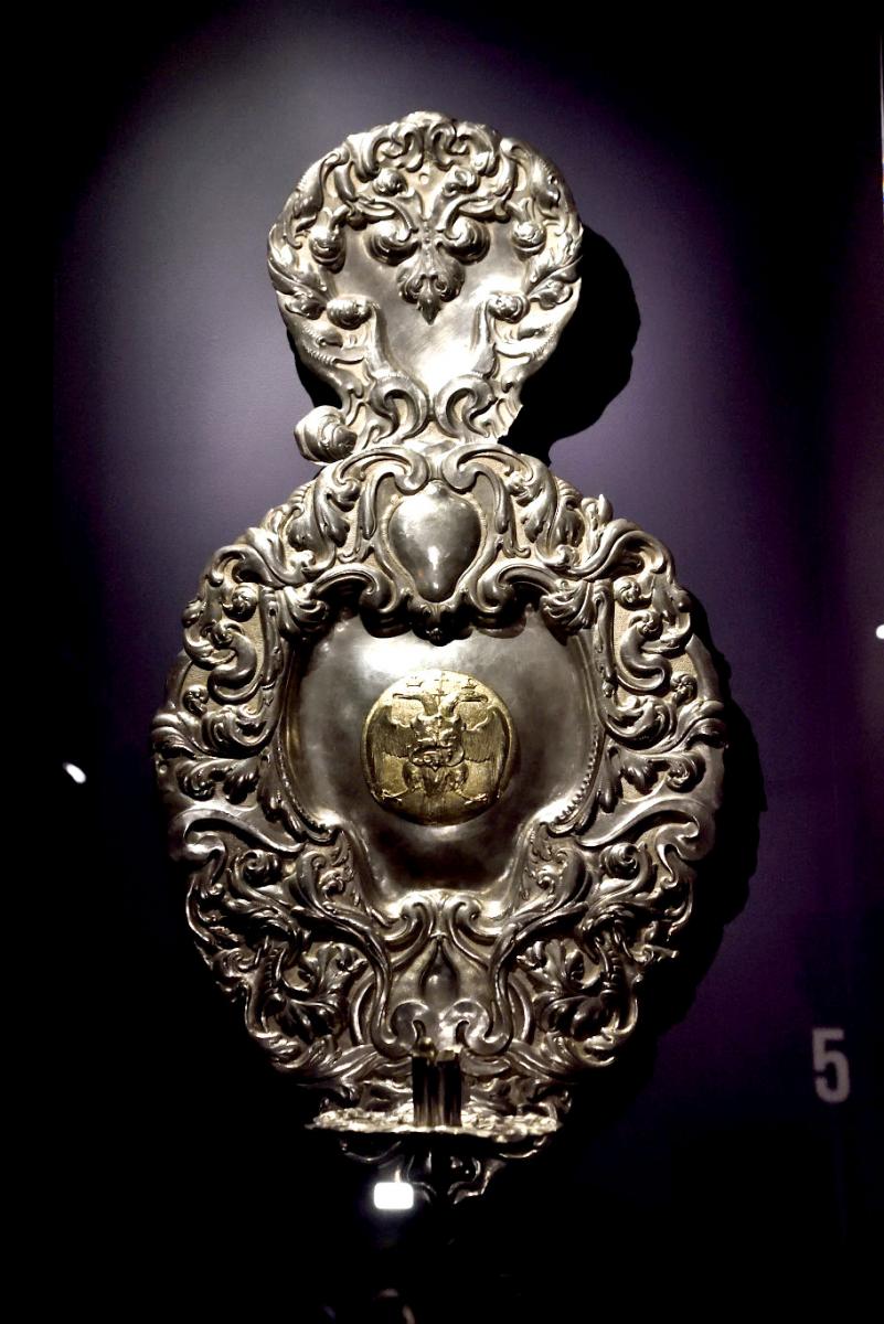 В выставочном зале Патриаршего дворца впервые собраны предметы, связанные с церемонией прощания с Петром Великим в Печальной зале Зимнего дворца и последующим торжественным шествием к месту захоронения в Петропавловском соборе. Среди экспонатов — государственные регалии, парадное конское убранство, а также доспехи «Печального» и «Радостного рыцарей», созданные по указу Екатерины I специально для церемонии 1725 года. Эти символические фигуры олицетворяли вечную славу монарха и торжество его дел.