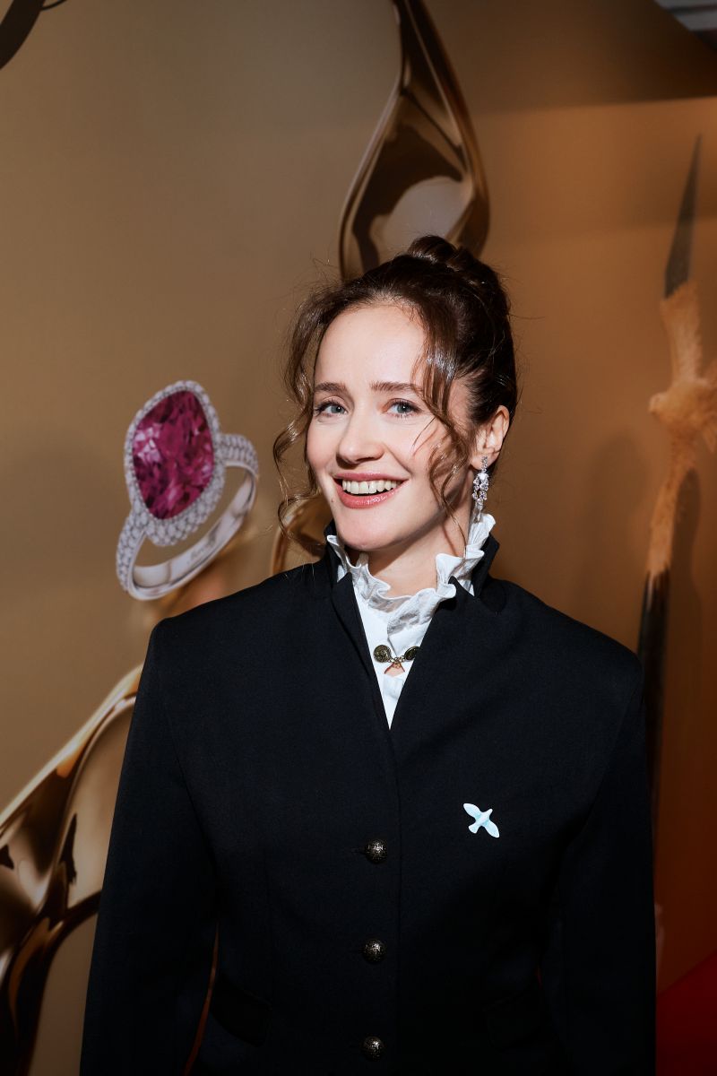 Мила Ершова дополнила образ серьгами и браслетом Mercury из коллекций Color и Classic из белого золота с бриллиантами и изумрудами.