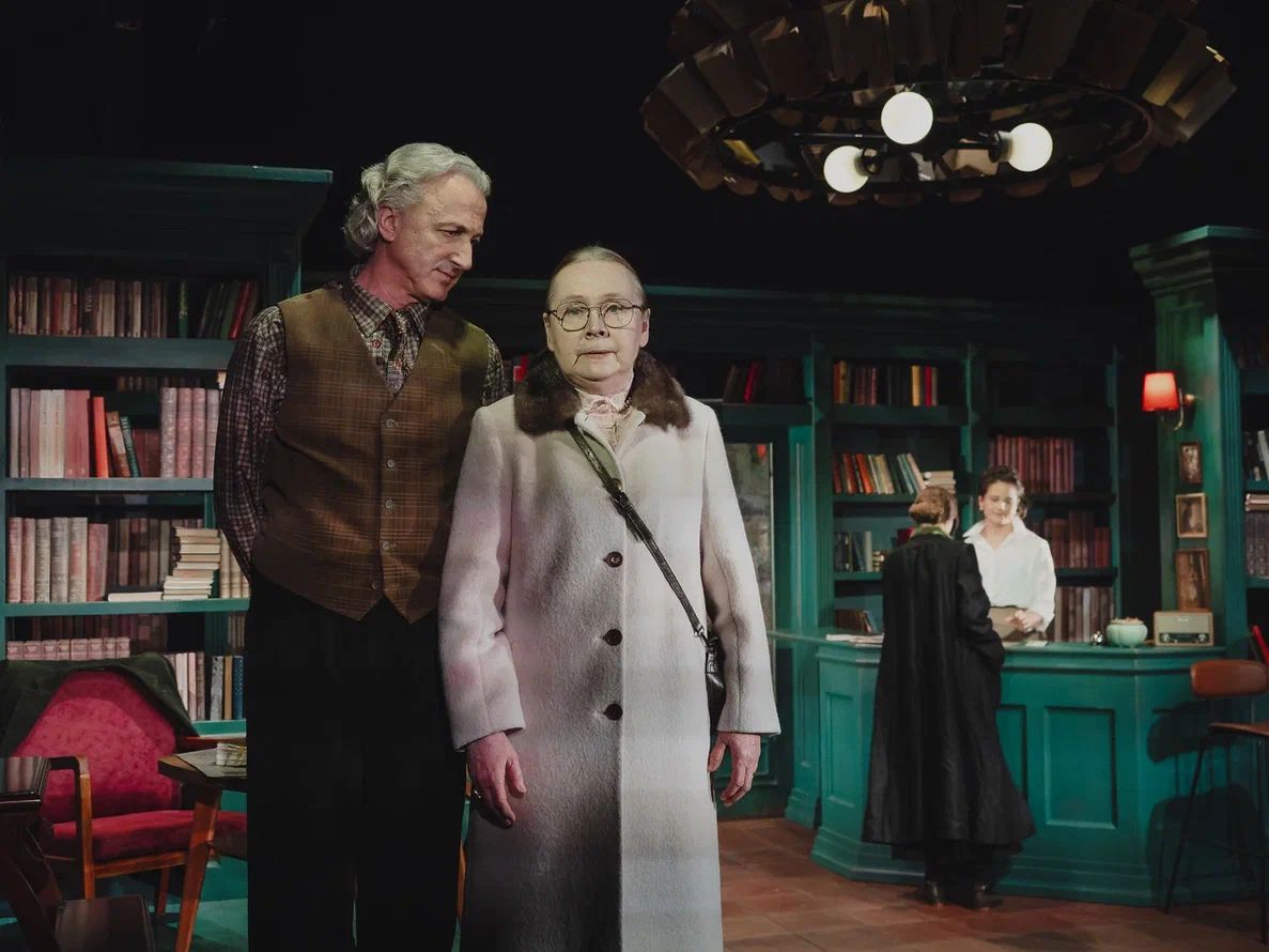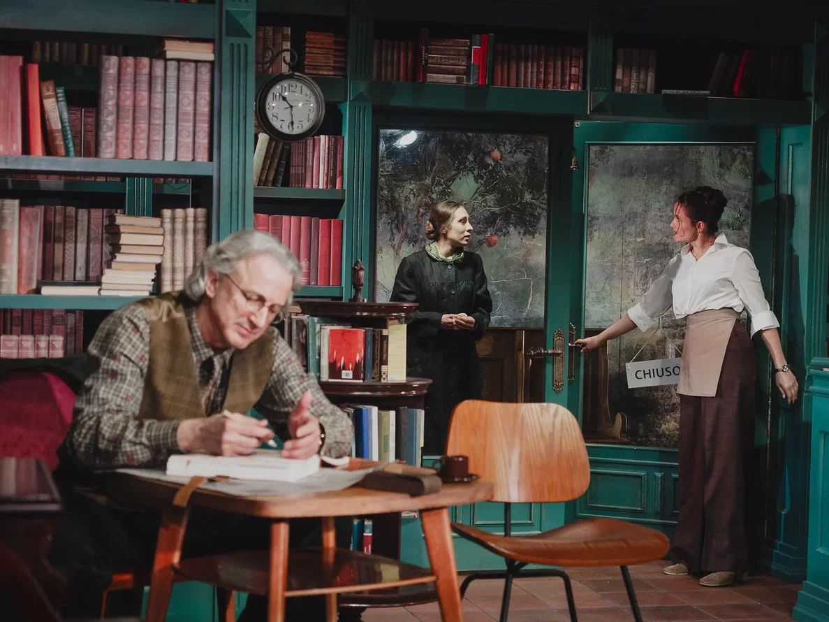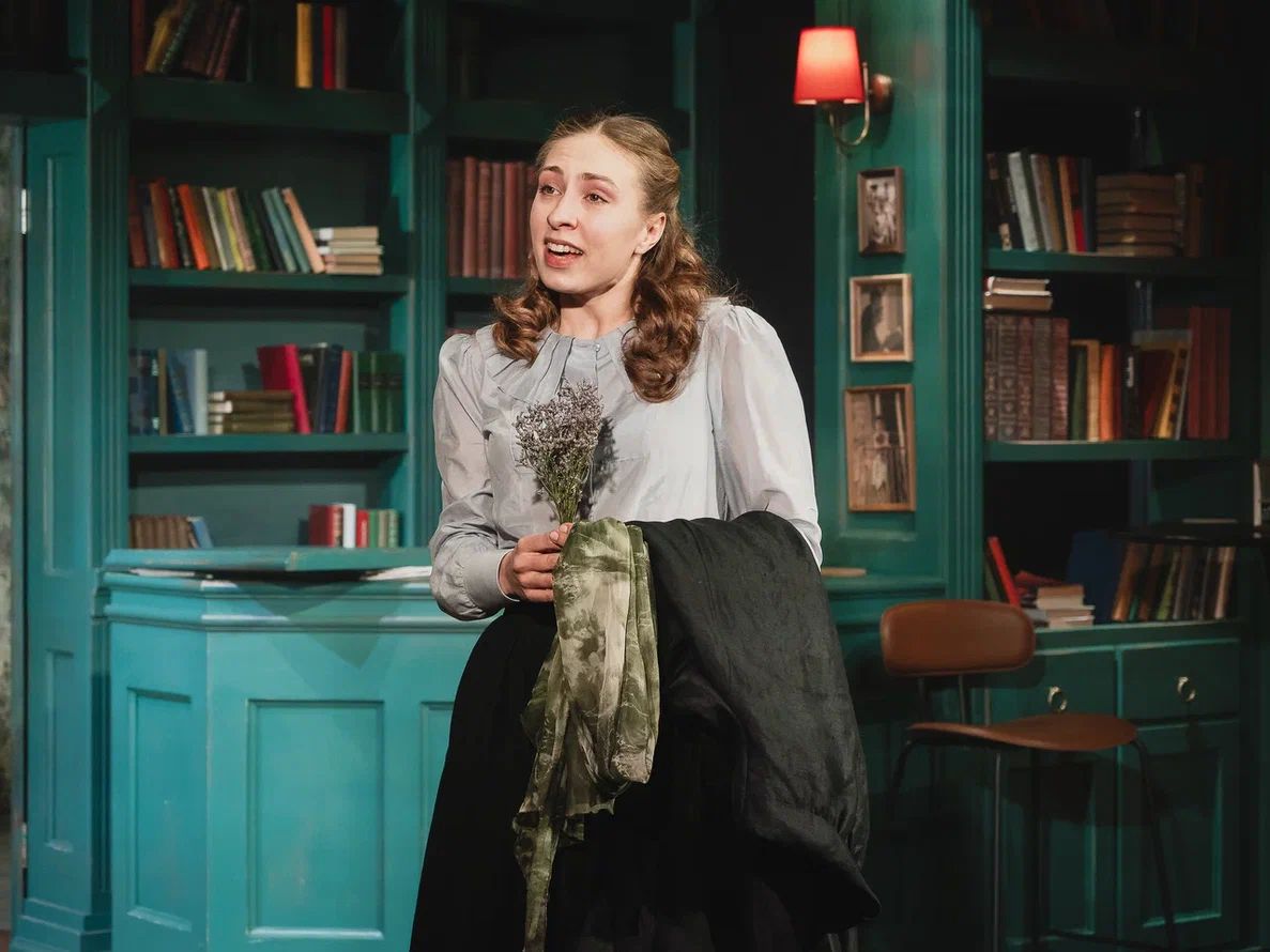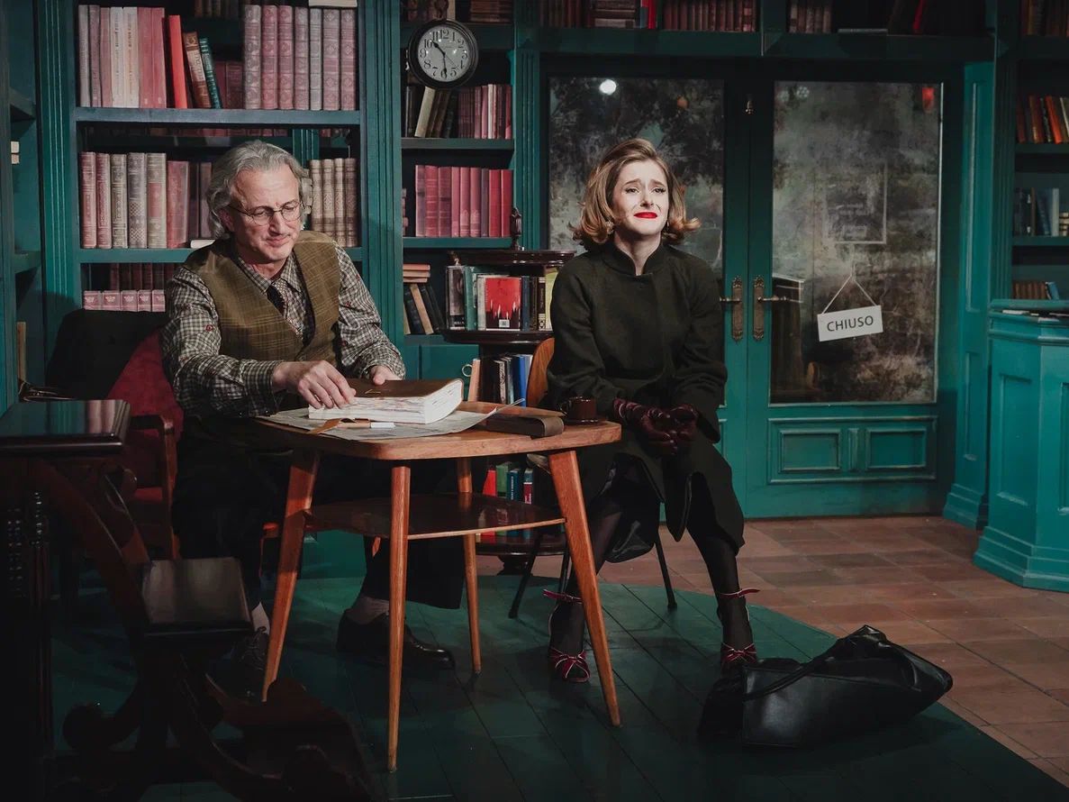 Сценография Марии Митрофановой погружает публику то ли в библиотеку, то ли в уютное литературное кафе. Основа декораций – стеллажи с книгами. Даже огромная люстра, сконструированная из книг, метафорично напоминает, что опыт человечества так или иначе отражается и продолжается в каждом из нас.