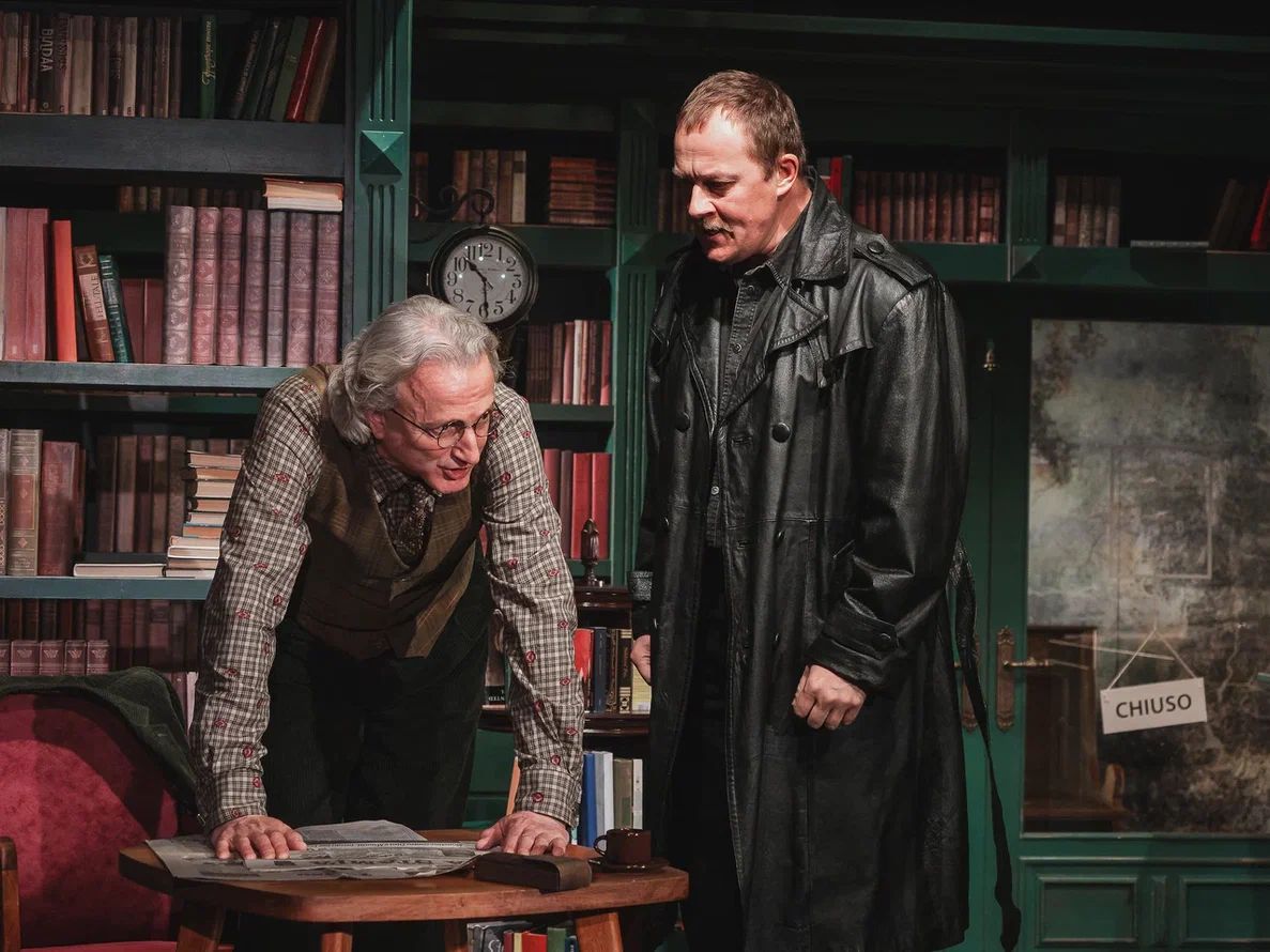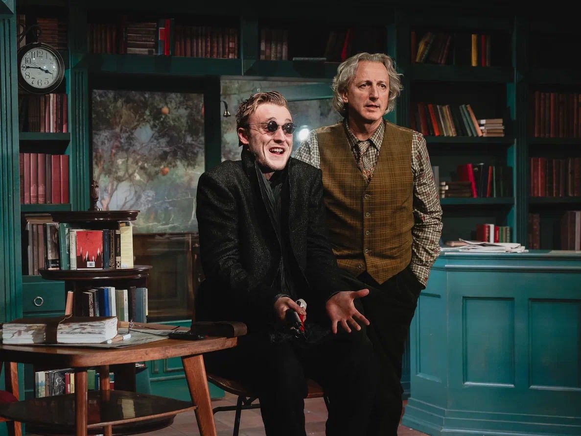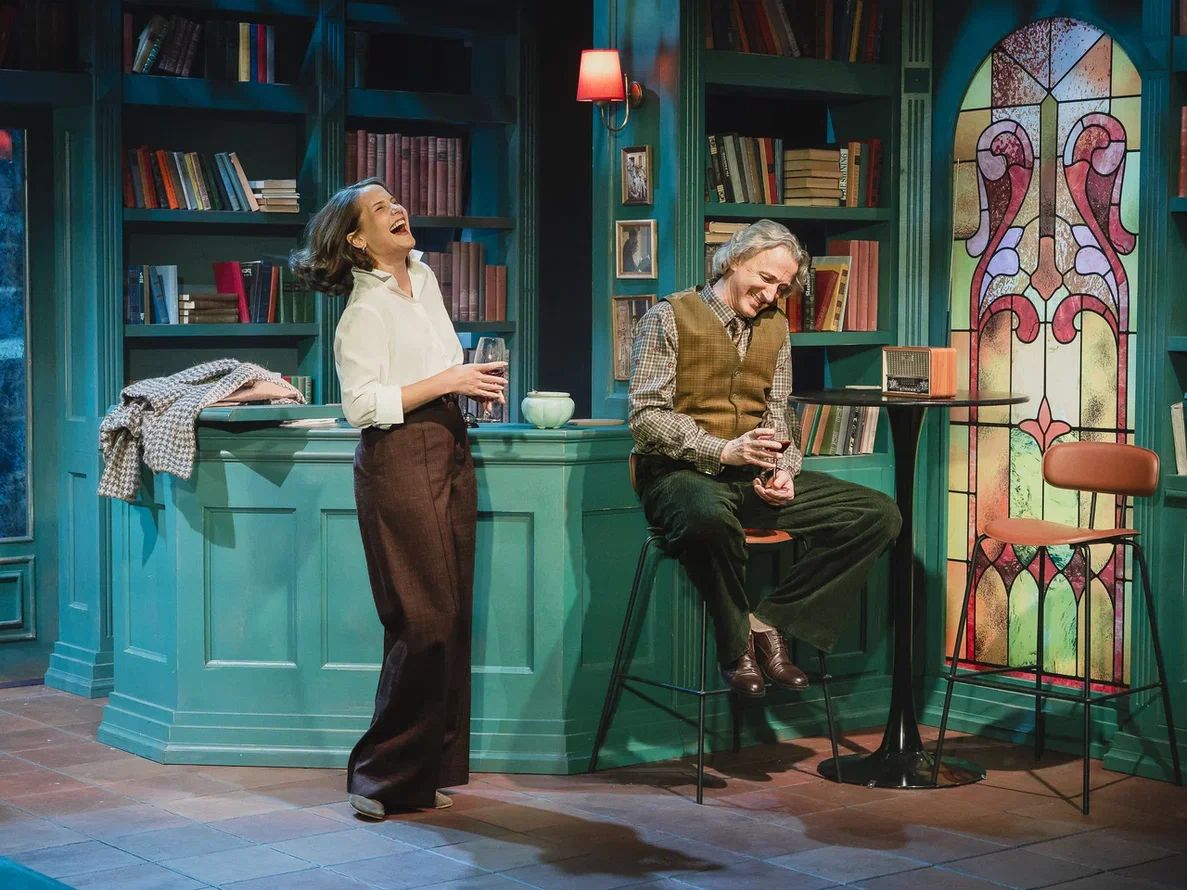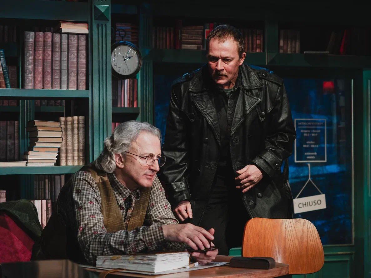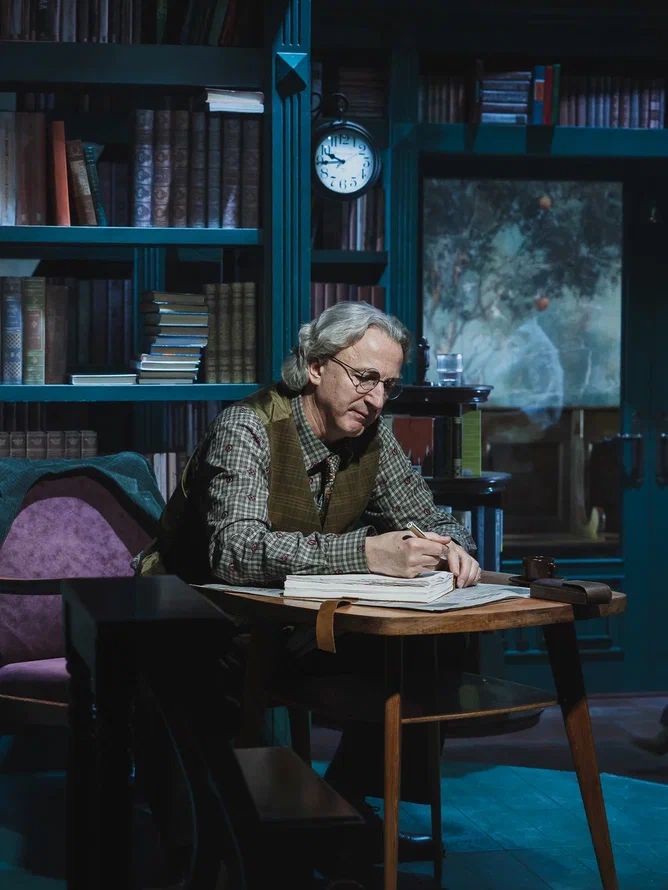 Сценография Марии Митрофановой погружает публику то ли в библиотеку, то ли в уютное литературное кафе. Основа декораций – стеллажи с книгами. Даже огромная люстра, сконструированная из книг, метафорично напоминает, что опыт человечества так или иначе отражается и продолжается в каждом из нас.