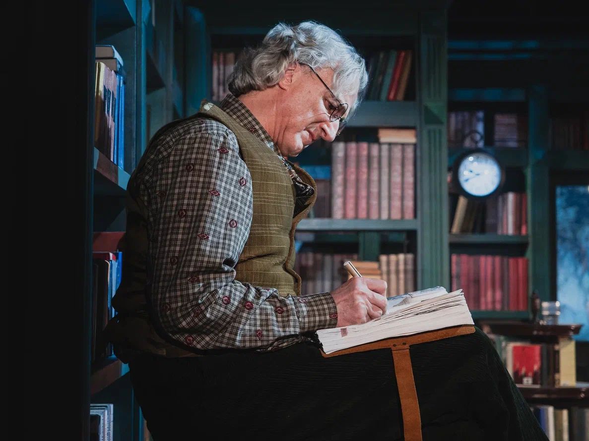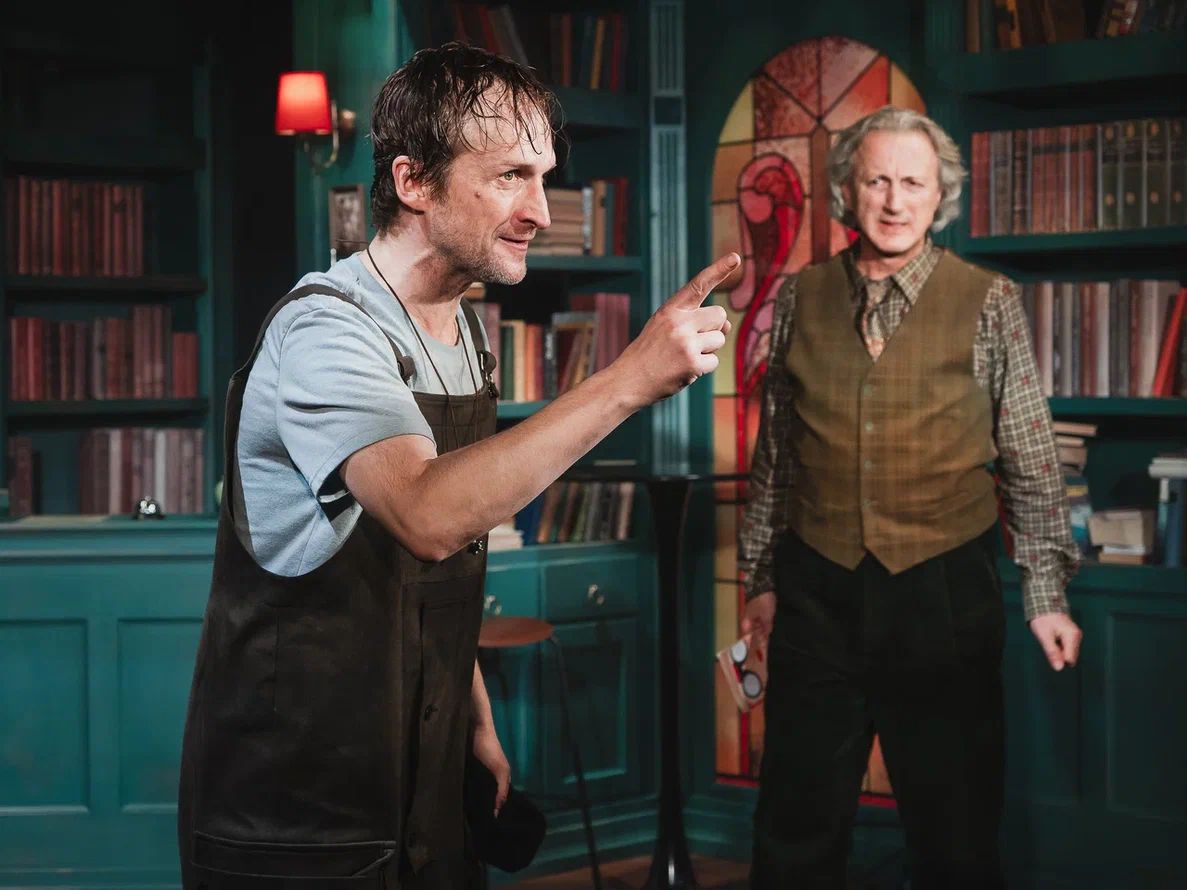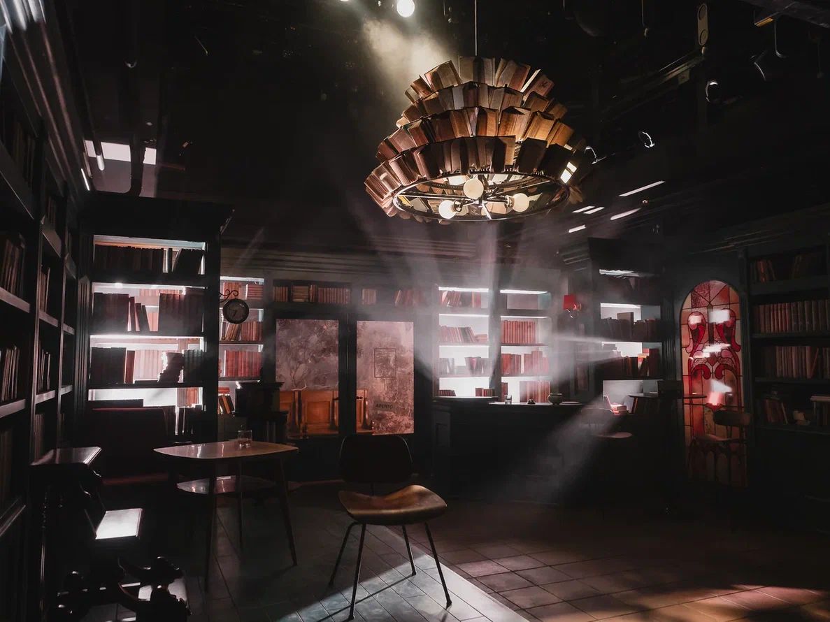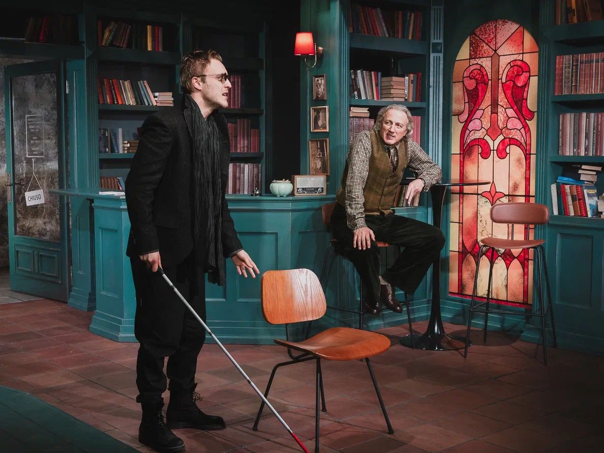 Сценография Марии Митрофановой погружает публику то ли в библиотеку, то ли в уютное литературное кафе. Основа декораций – стеллажи с книгами. Даже огромная люстра, сконструированная из книг, метафорично напоминает, что опыт человечества так или иначе отражается и продолжается в каждом из нас.